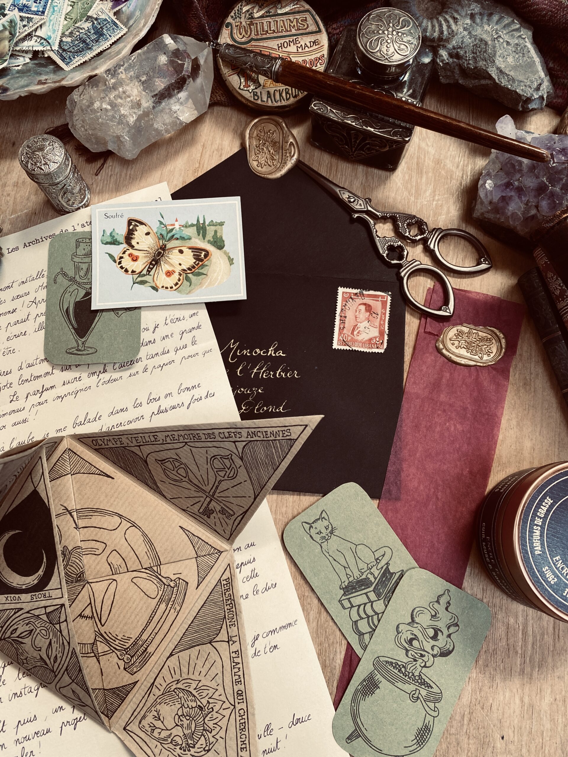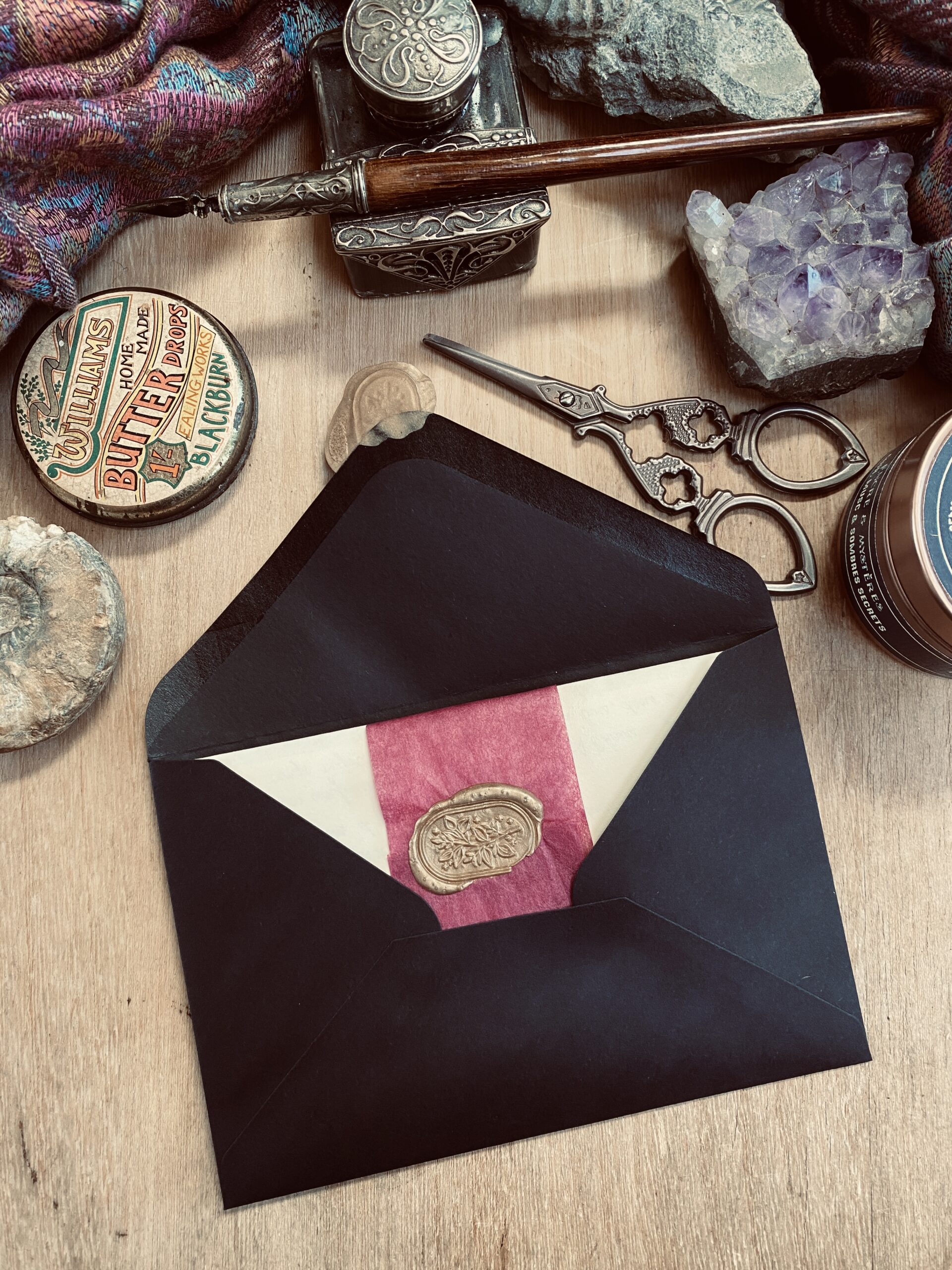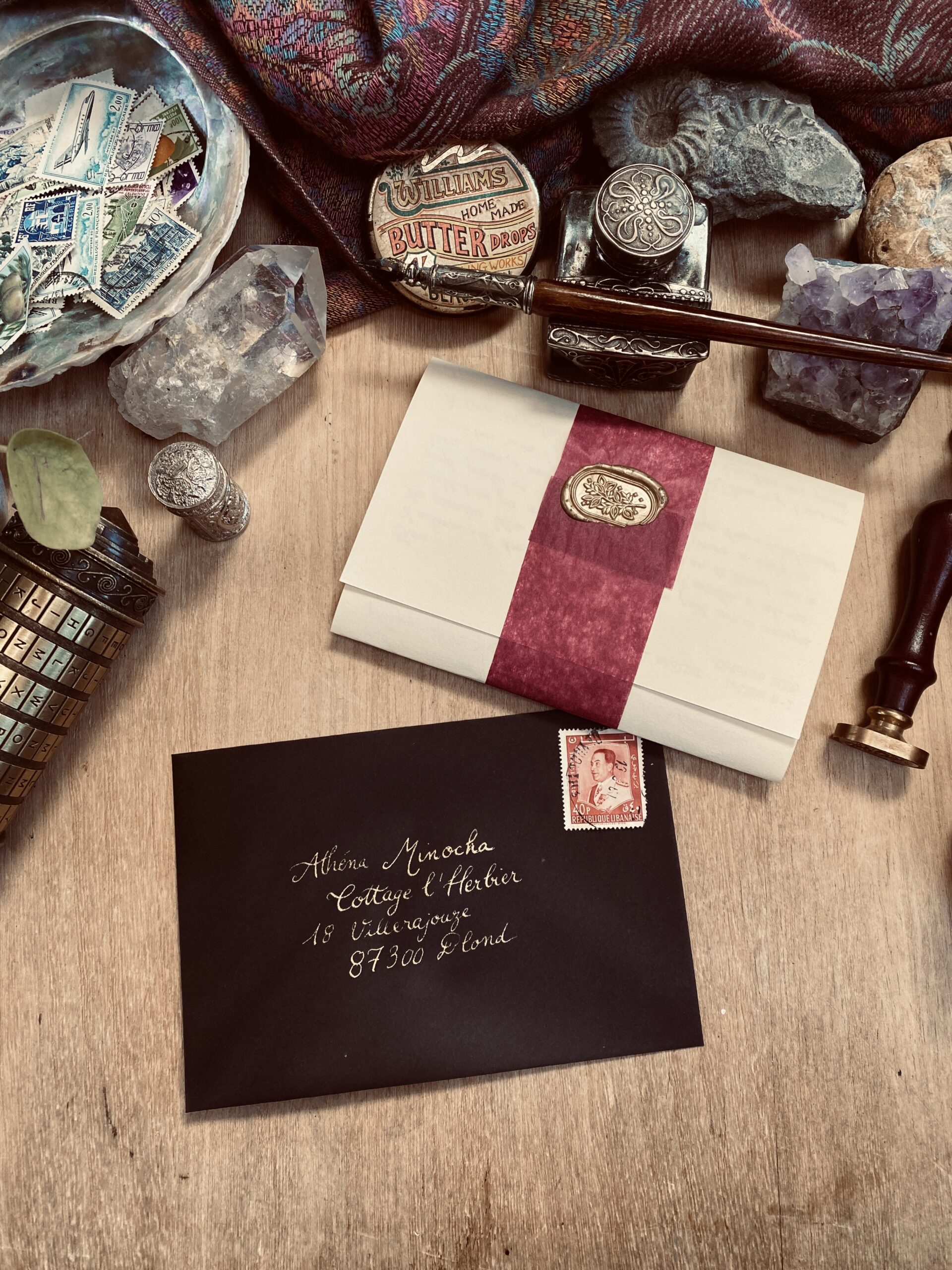 – Une enveloppe noire calligraphiée en doré et cachetée à la cire